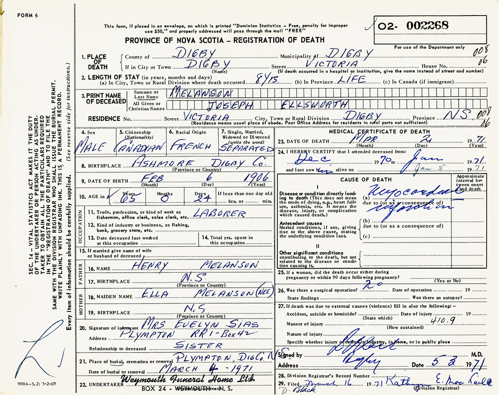 PROVINCE OF NOVA SCOTIA — REGISTRATION OF DEATH