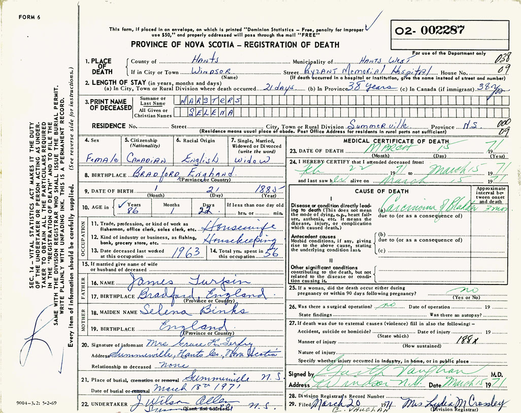 21. Place of burial Summerville, NS