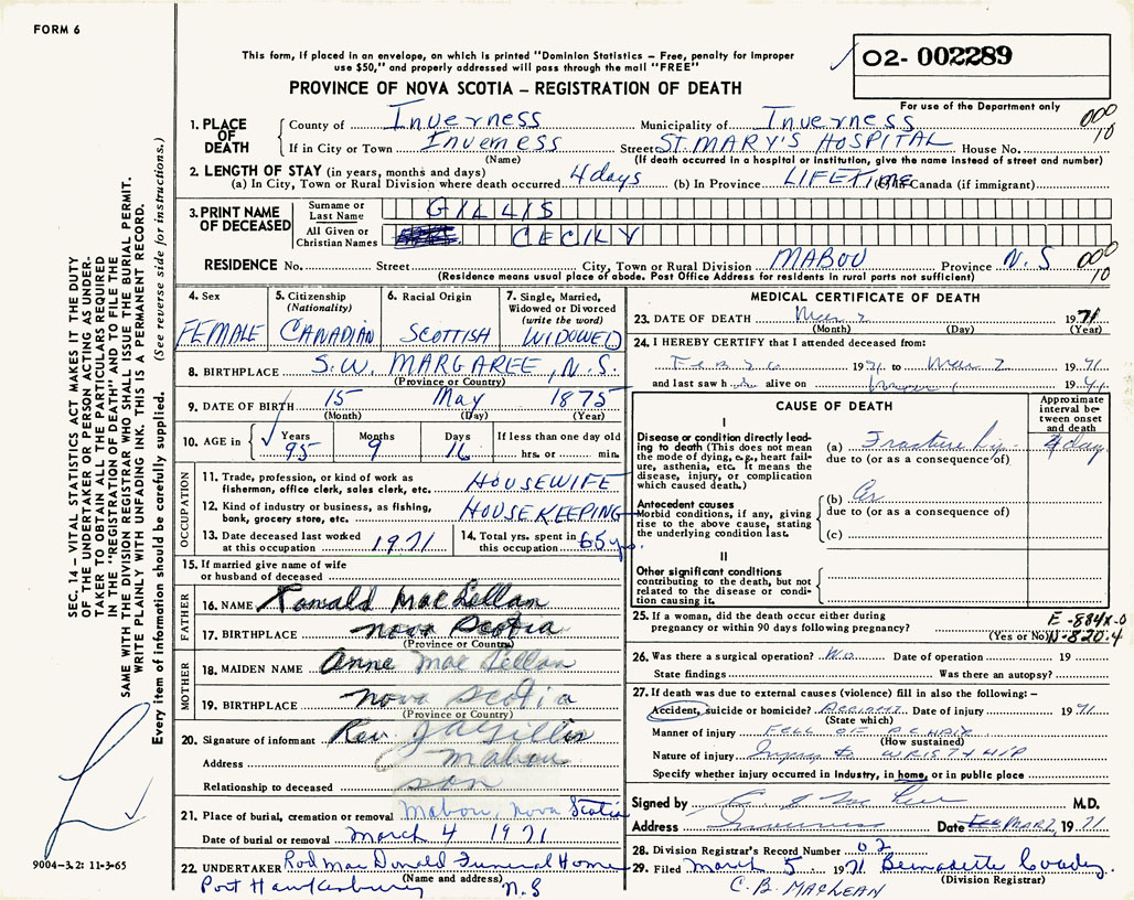PROVINCE OF NOVA SCOTIA — REGISTRATION OF DEATH