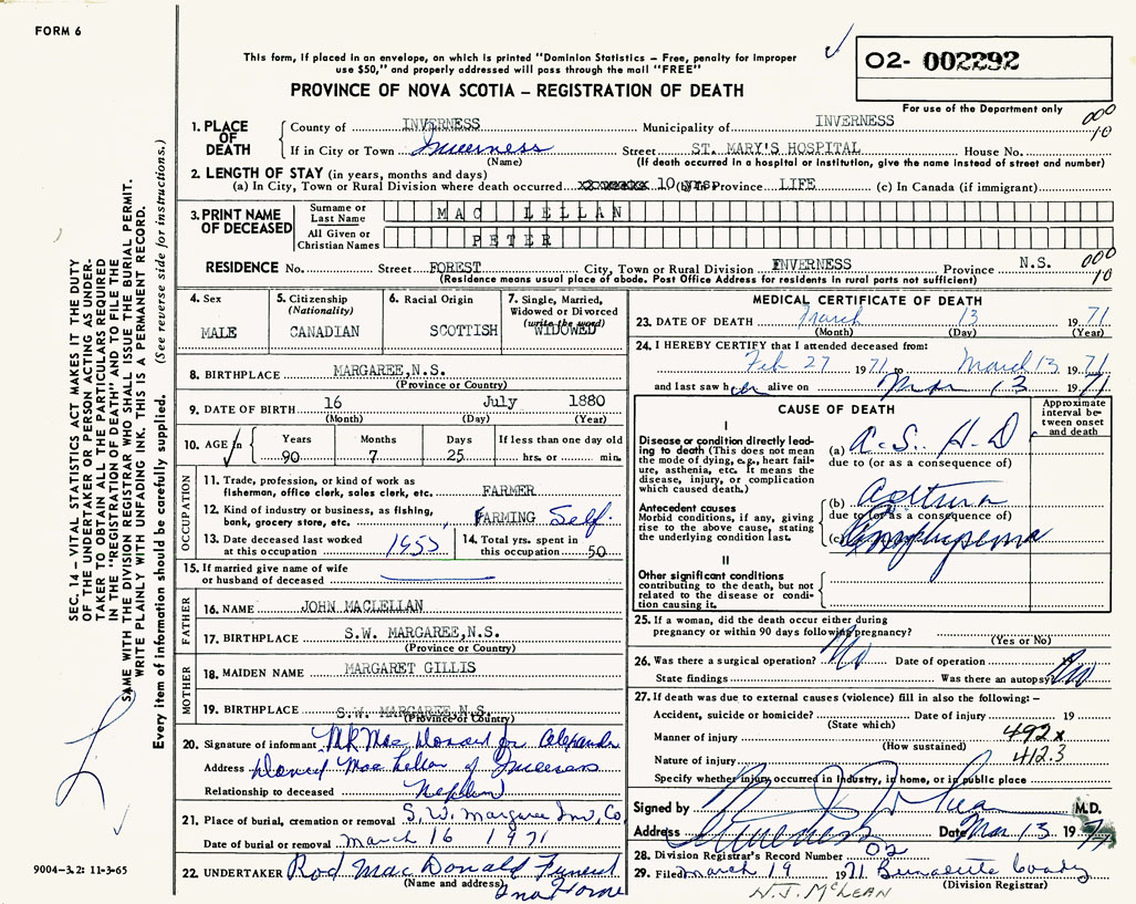 PROVINCE OF NOVA SCOTIA — REGISTRATION OF DEATH