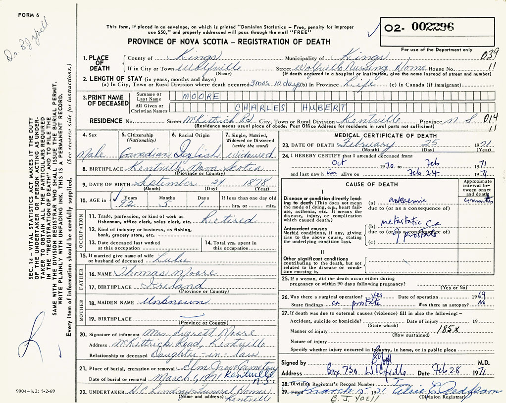 PROVINCE OF NOVA SCOTIA — REGISTRATION OF DEATH