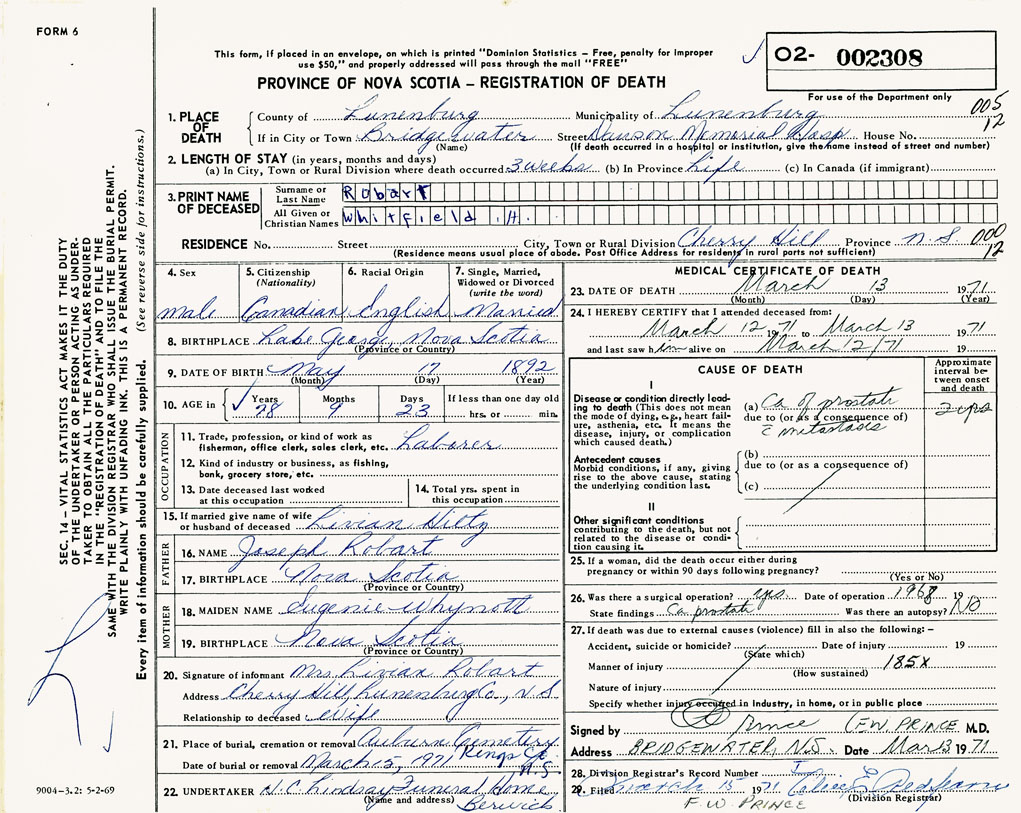 PROVINCE OF NOVA SCOTIA — REGISTRATION OF DEATH