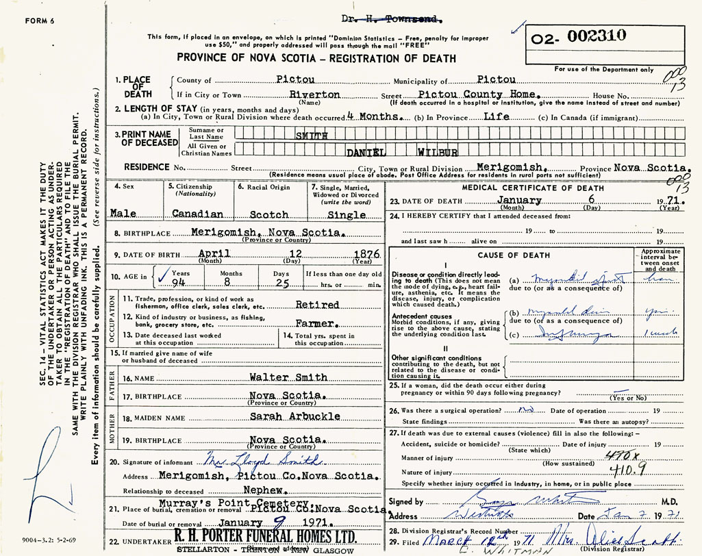 PROVINCE OF NOVA SCOTIA — REGISTRATION OF DEATH