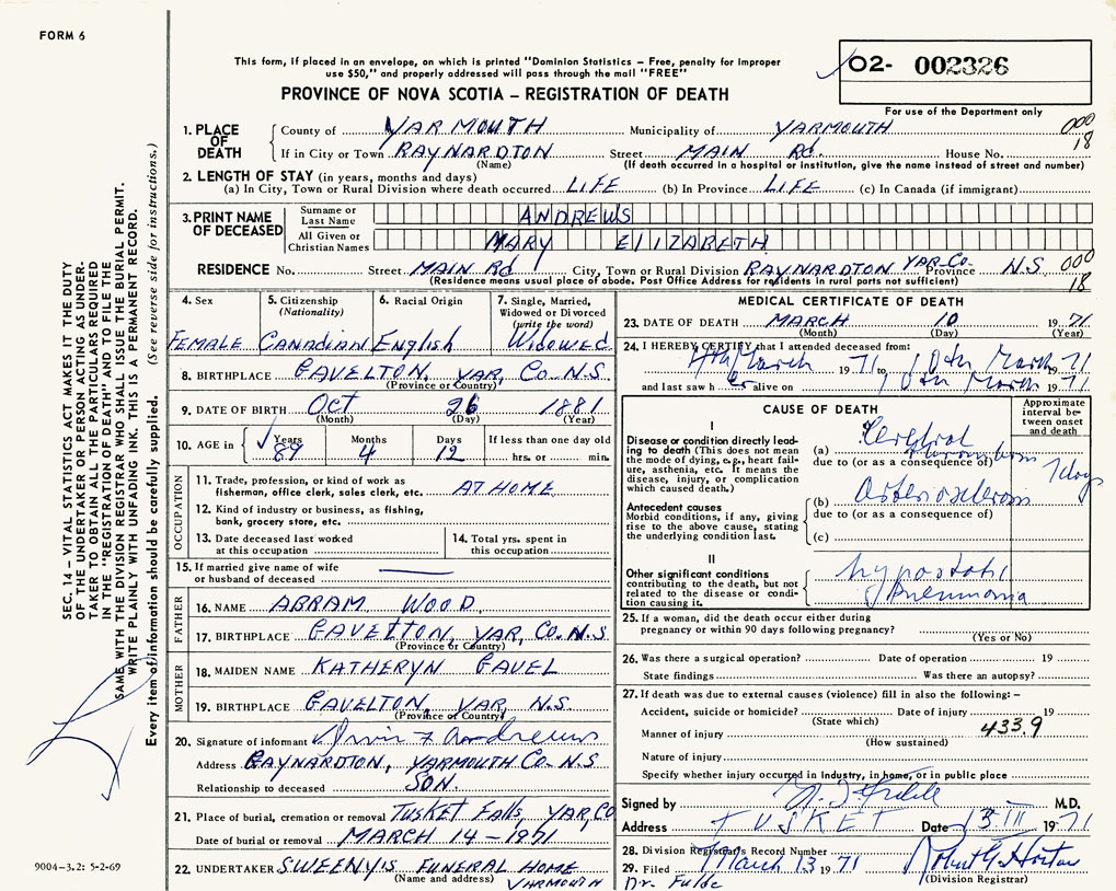 PROVINCE OF NOVA SCOTIA — REGISTRATION OF DEATH