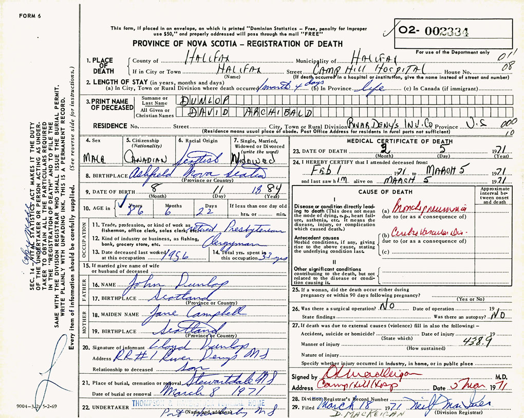 PROVINCE OF NOVA SCOTIA — REGISTRATION OF DEATH