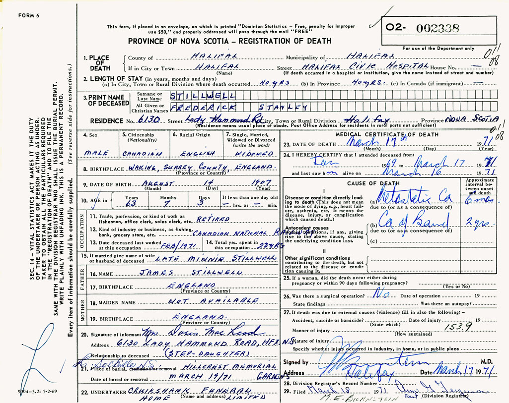 PROVINCE OF NOVA SCOTIA — REGISTRATION OF DEATH