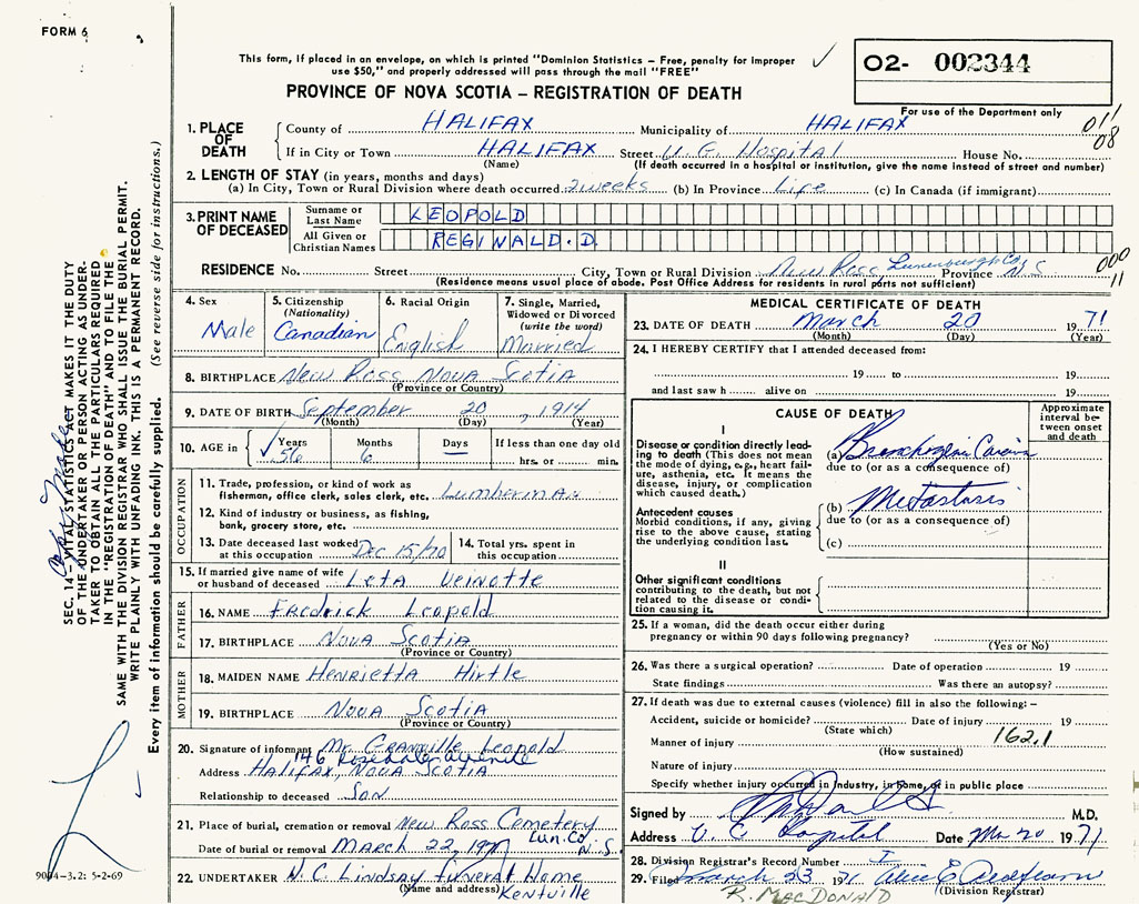 PROVINCE OF NOVA SCOTIA — REGISTRATION OF DEATH