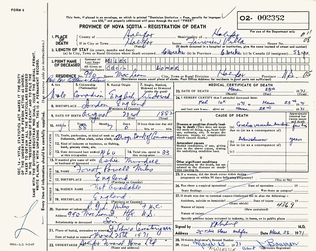PROVINCE OF NOVA SCOTIA — REGISTRATION OF DEATH