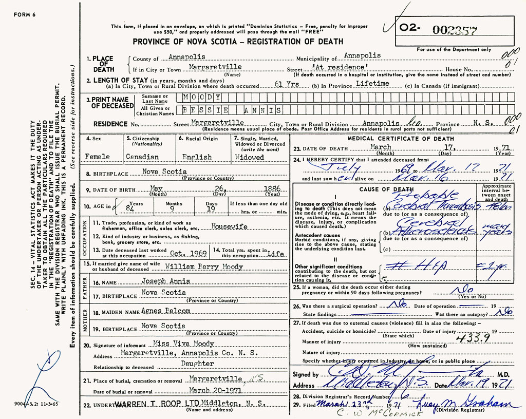 PROVINCE OF NOVA SCOTIA — REGISTRATION OF DEATH