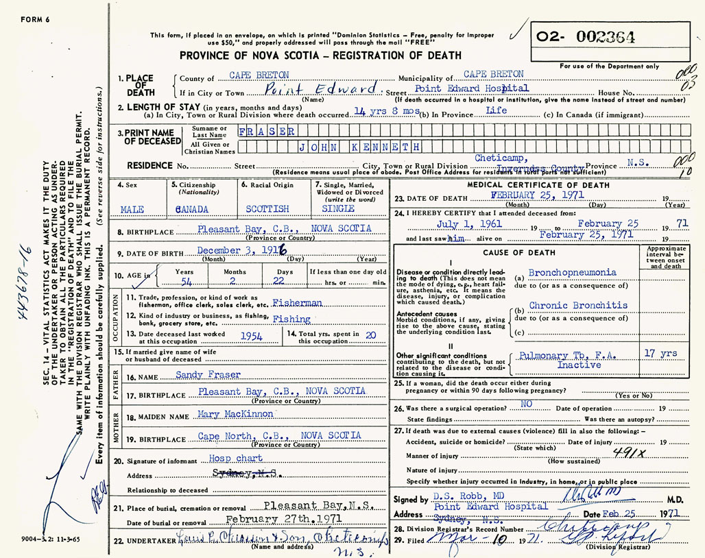 1. PLACE OF DEATH County of Cape Breton If in City or Town Point Edward