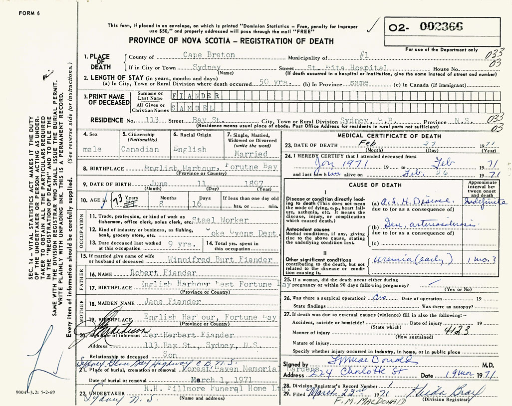 1. PLACE OF DEATH County of Cape Breton If in City or Town Sydney