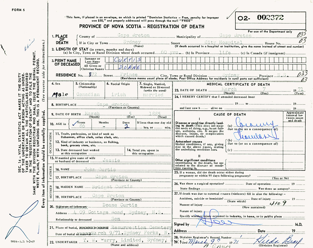1. PLACE OF DEATH County of Cape Breton If in City or Town Sydney