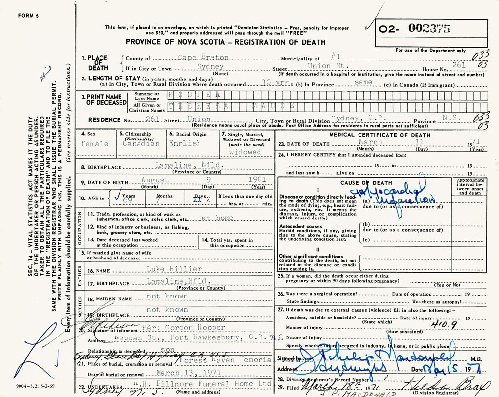PROVINCE OF NOVA SCOTIA — REGISTRATION OF DEATH