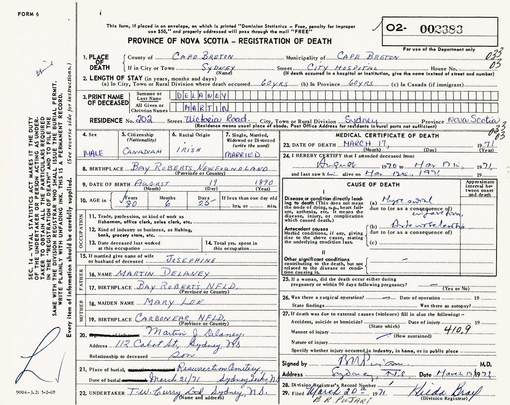 1. PLACE OF DEATH County of Cape Breton If in City or Town Sydney