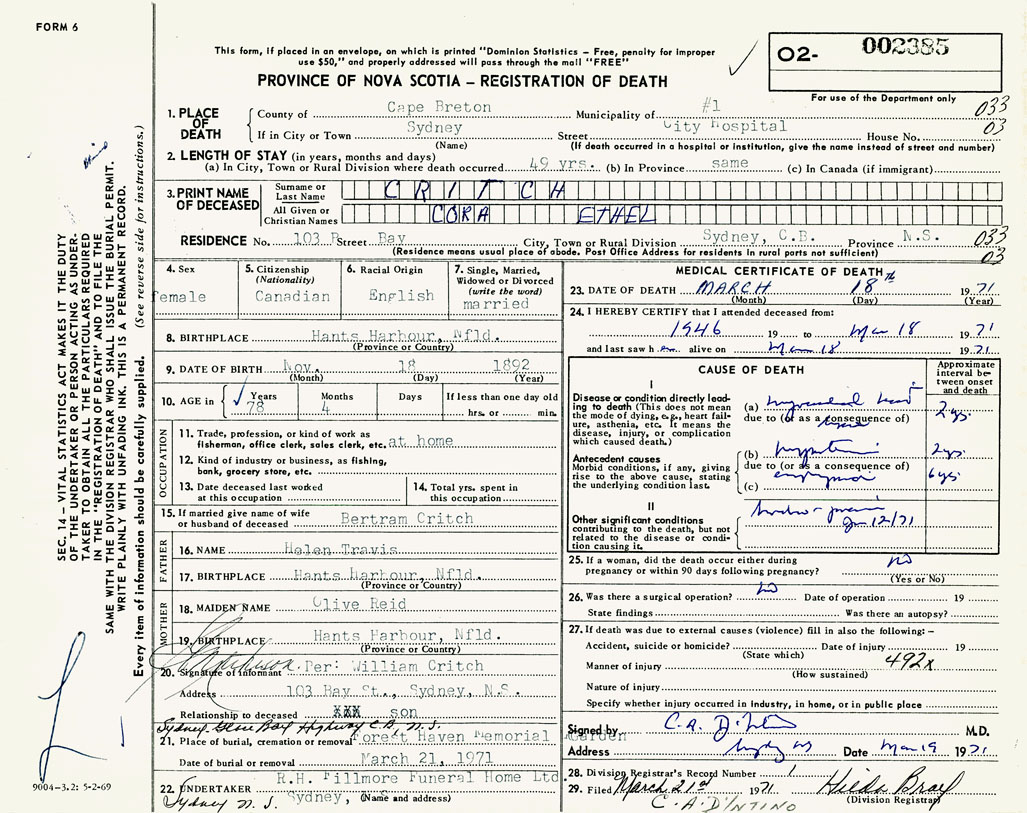 3. PRINT NAME OF DECEASED Critch, Cora Ethel