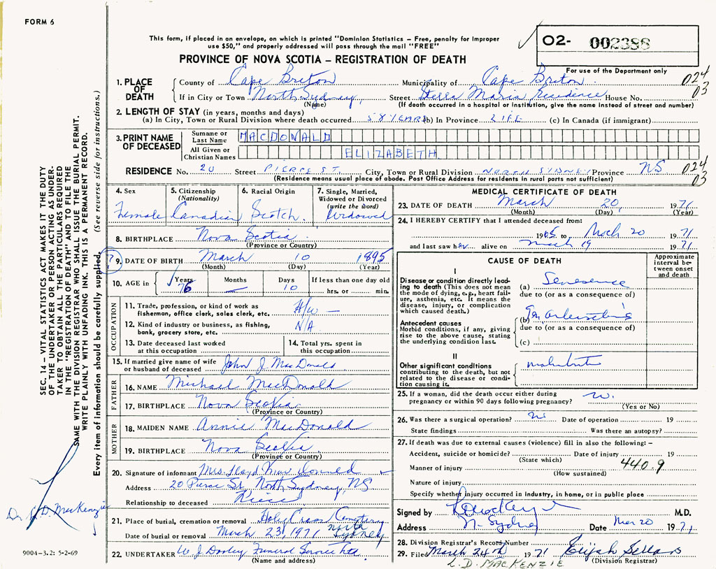 PROVINCE OF NOVA SCOTIA — REGISTRATION OF DEATH