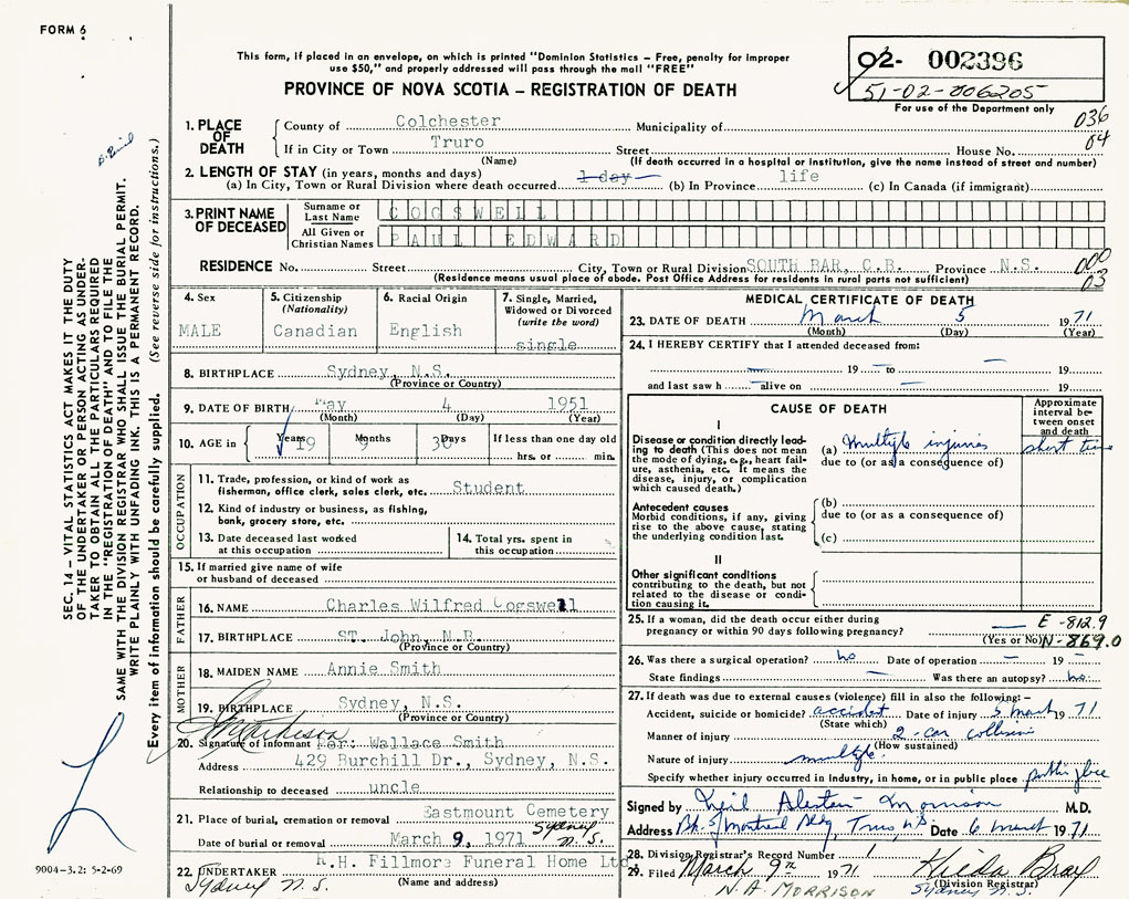 PROVINCE OF NOVA SCOTIA — REGISTRATION OF DEATH