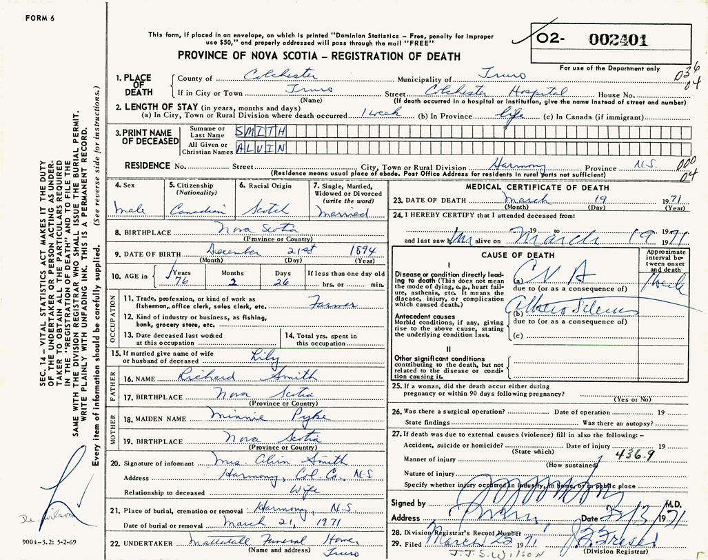 PROVINCE OF NOVA SCOTIA — REGISTRATION OF DEATH