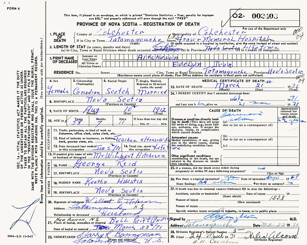 1. PLACE OF DEATH County of Colchester If in City or Town Tatamagouche