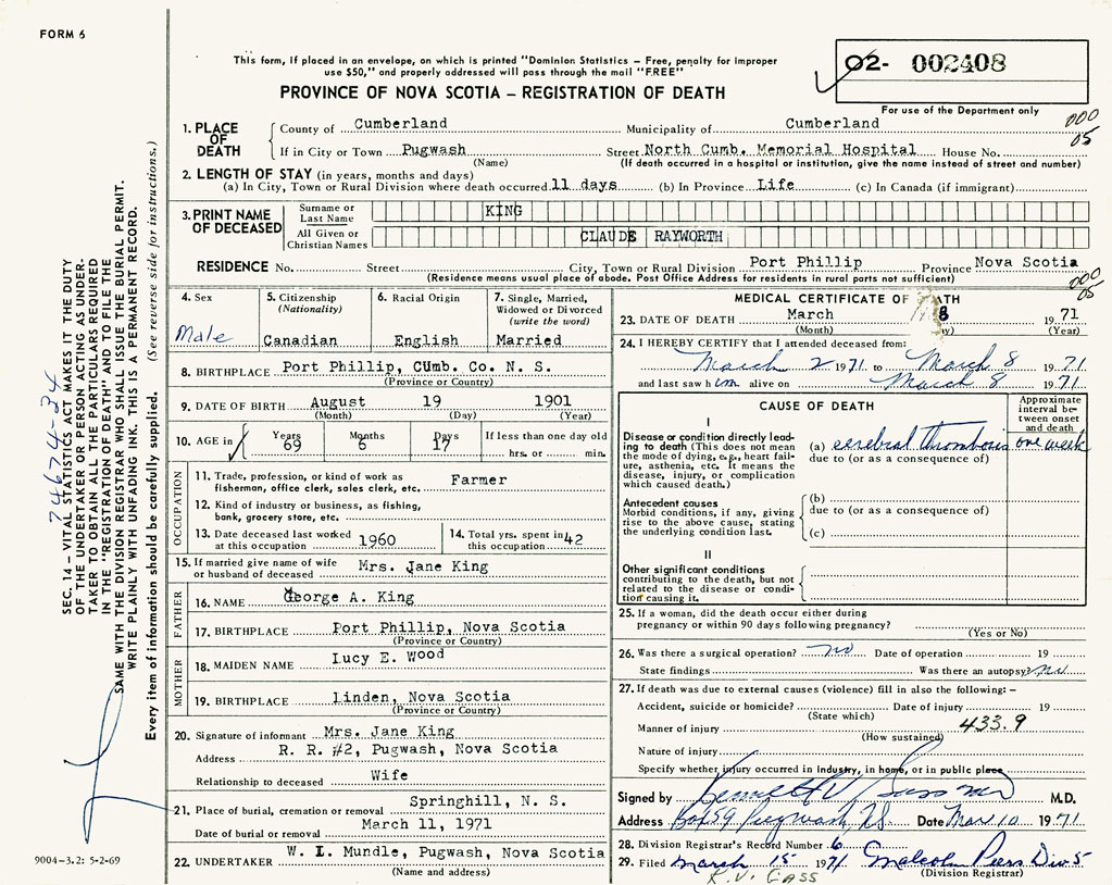 PROVINCE OF NOVA SCOTIA — REGISTRATION OF DEATH