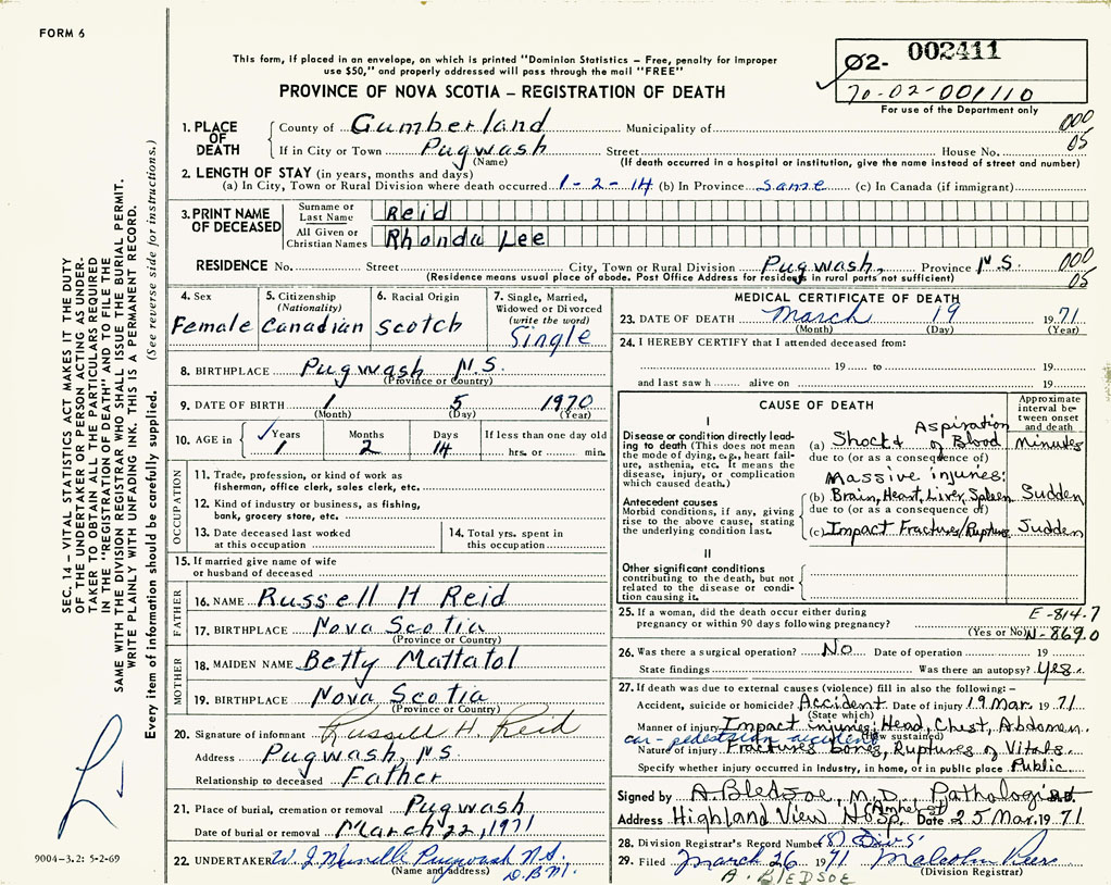 1. PLACE OF DEATH County of Cumberland If in City or Town Pugwash