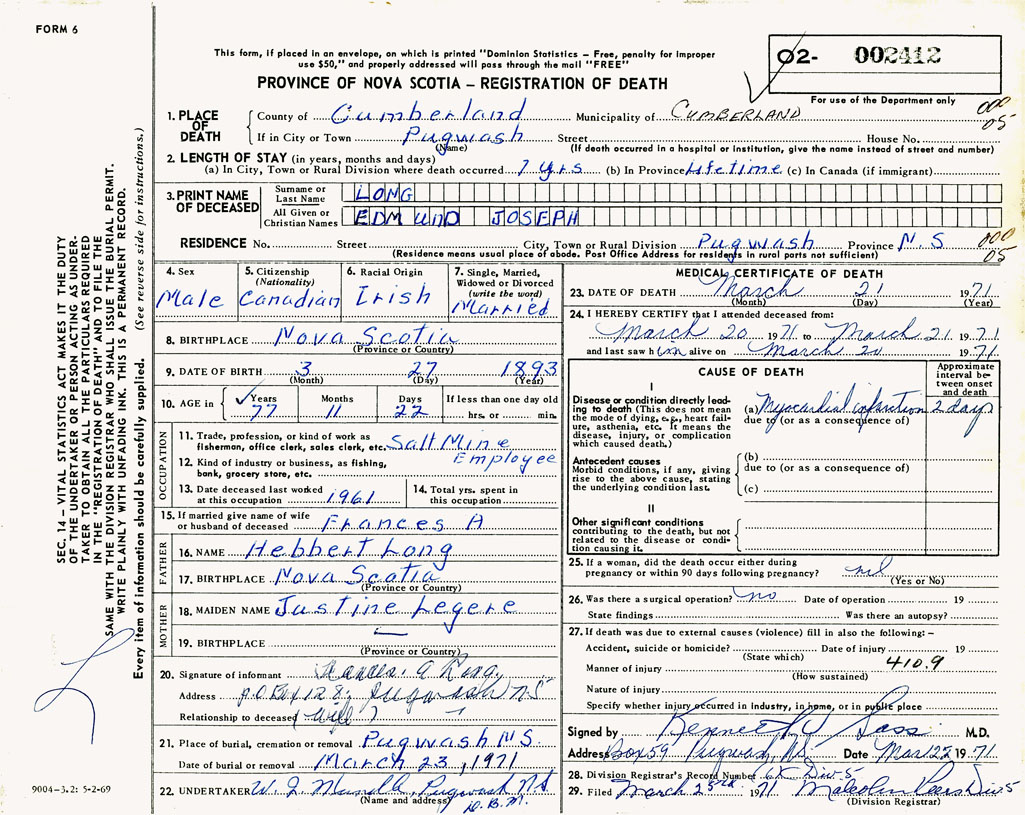 1. PLACE OF DEATH County of Cumberland If in City or Town Pugwash
