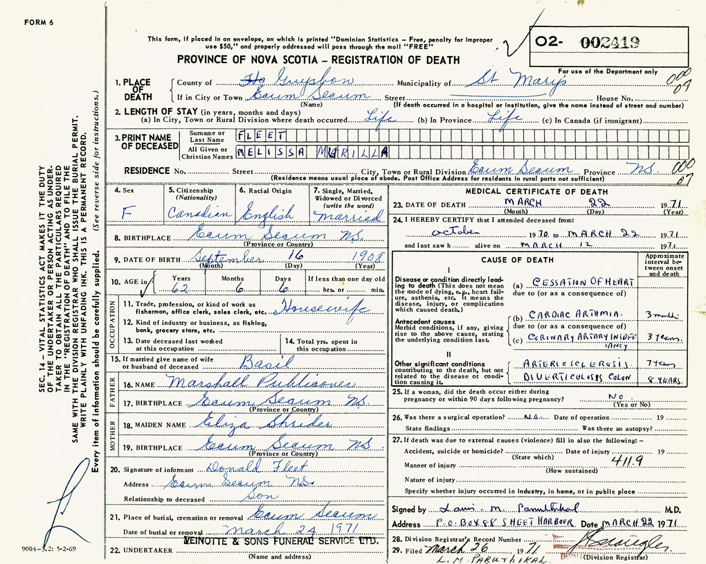 PROVINCE OF NOVA SCOTIA — REGISTRATION OF DEATH