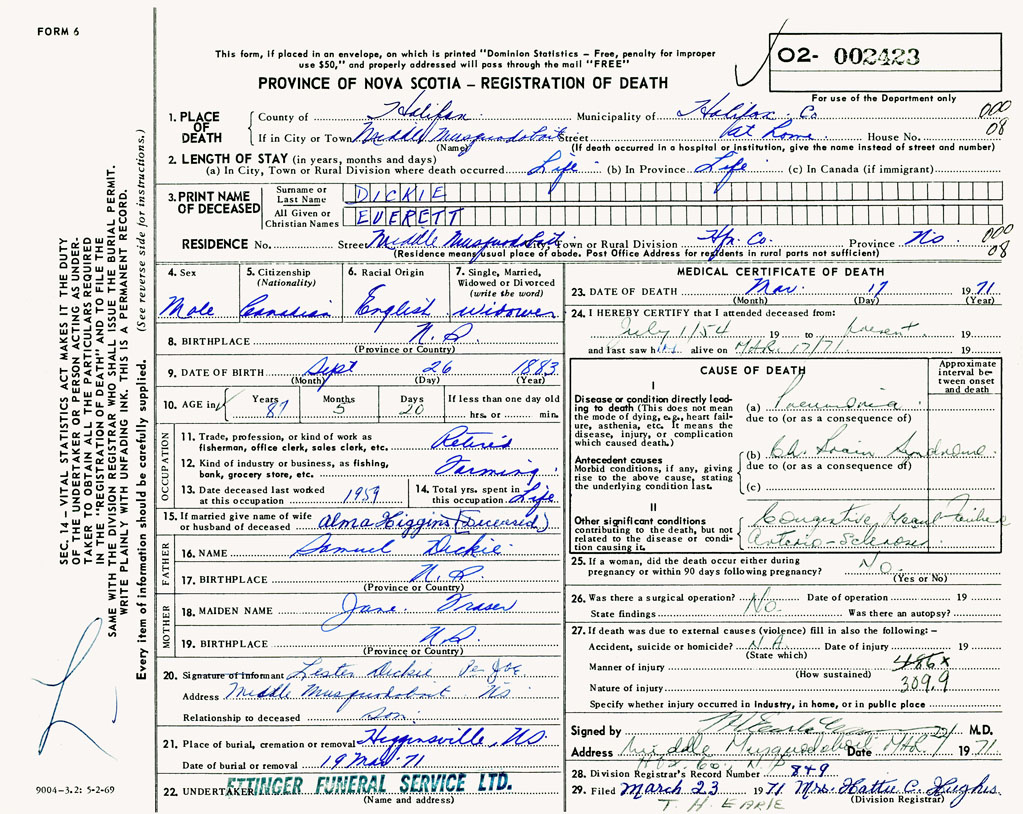 21. Place of burial Higginsville, NS