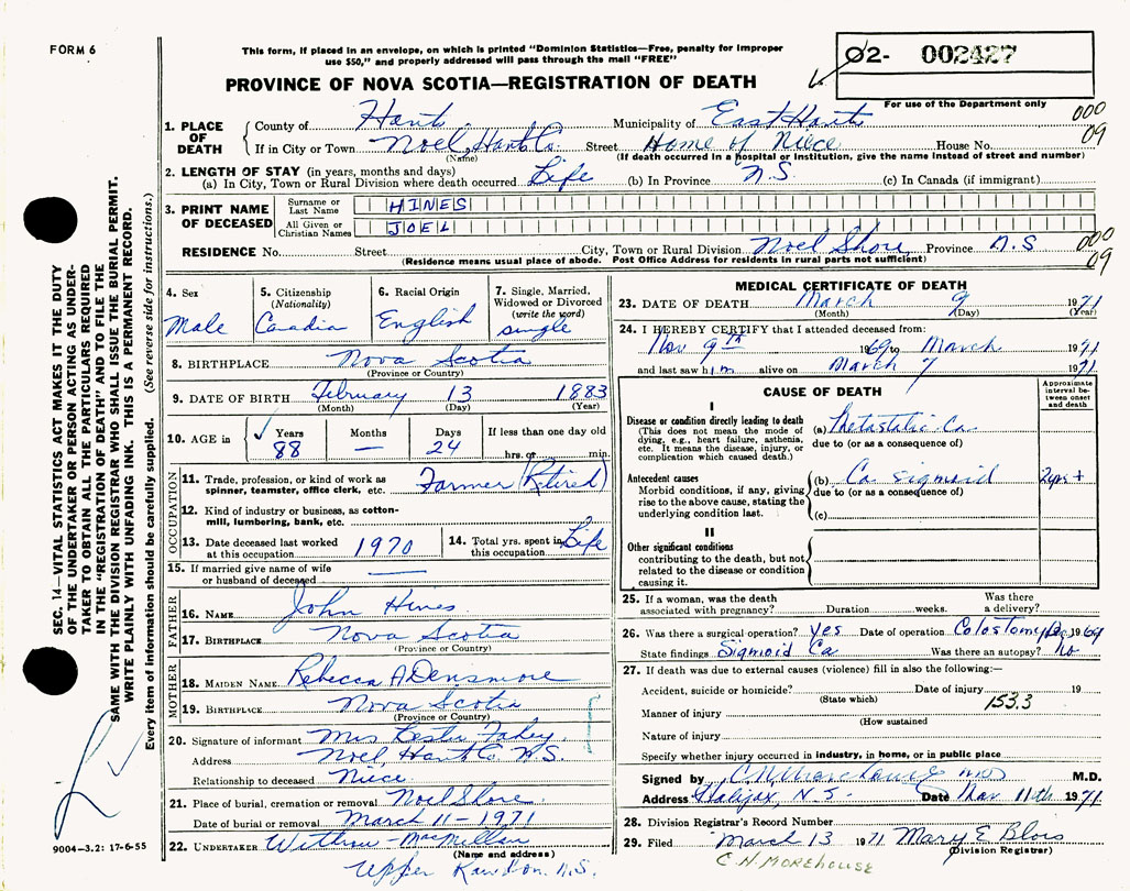PROVINCE OF NOVA SCOTIA — REGISTRATION OF DEATH