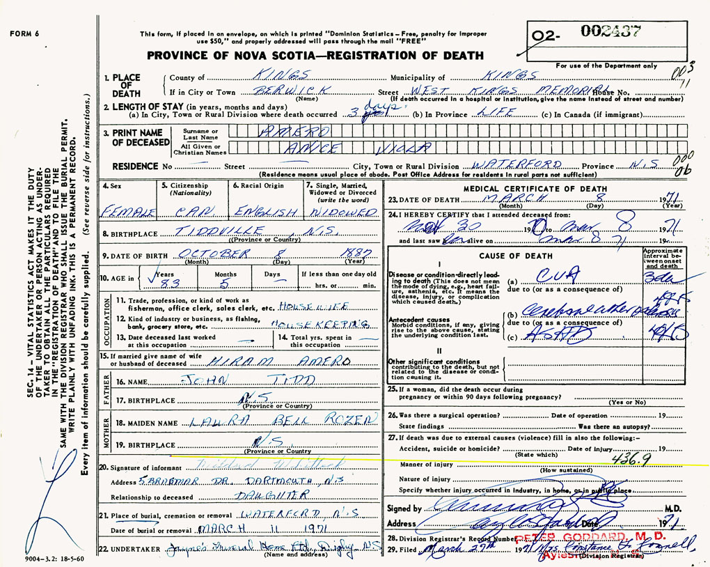 PROVINCE OF NOVA SCOTIA — REGISTRATION OF DEATH