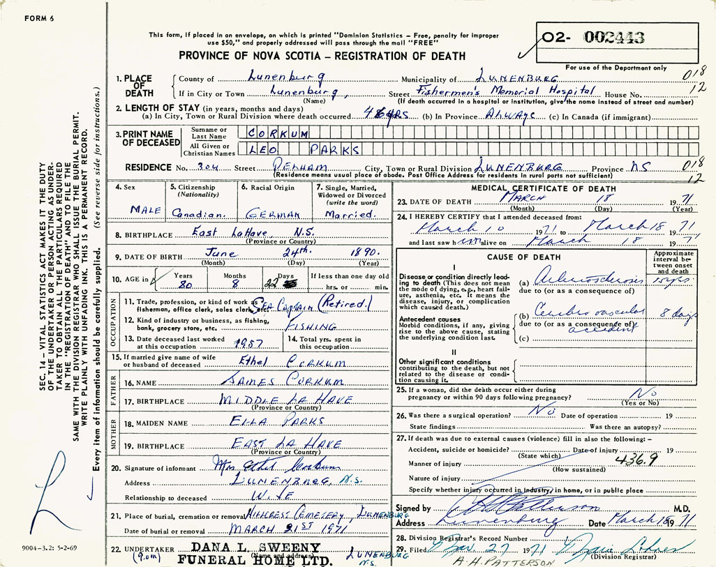21. Place of burial Hillcrest Cemetery, Lunenburg