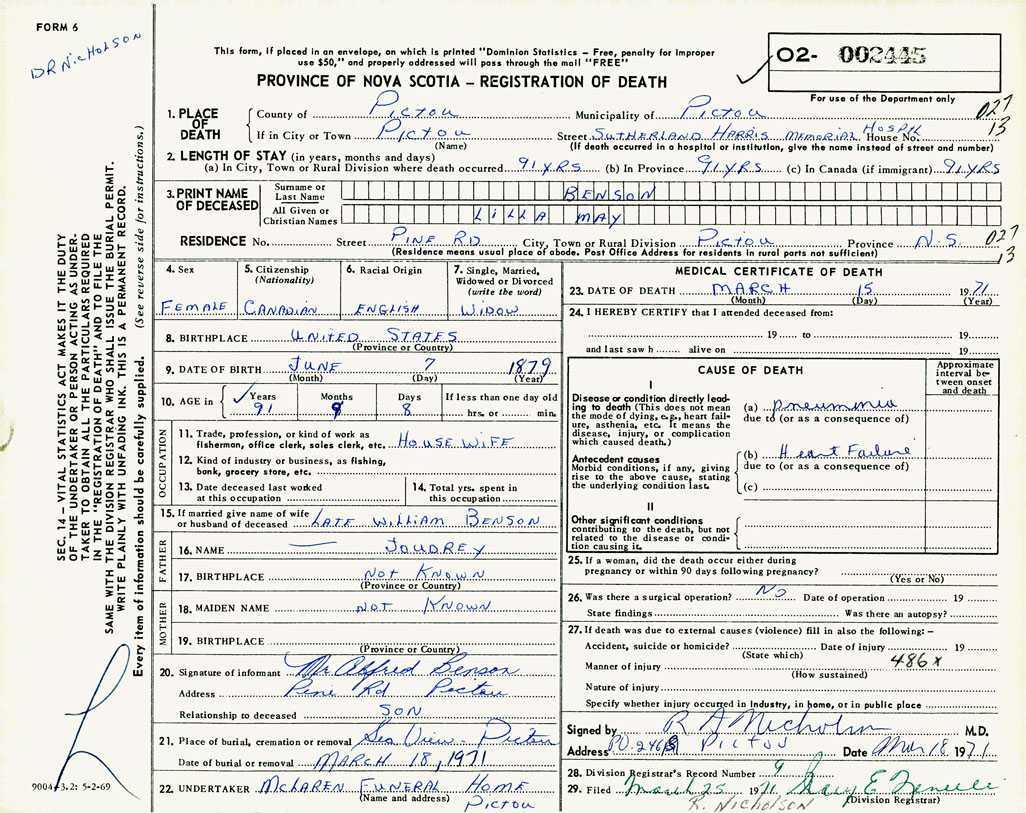 1. PLACE OF DEATH County of Pictou If in City or Town Pictou
