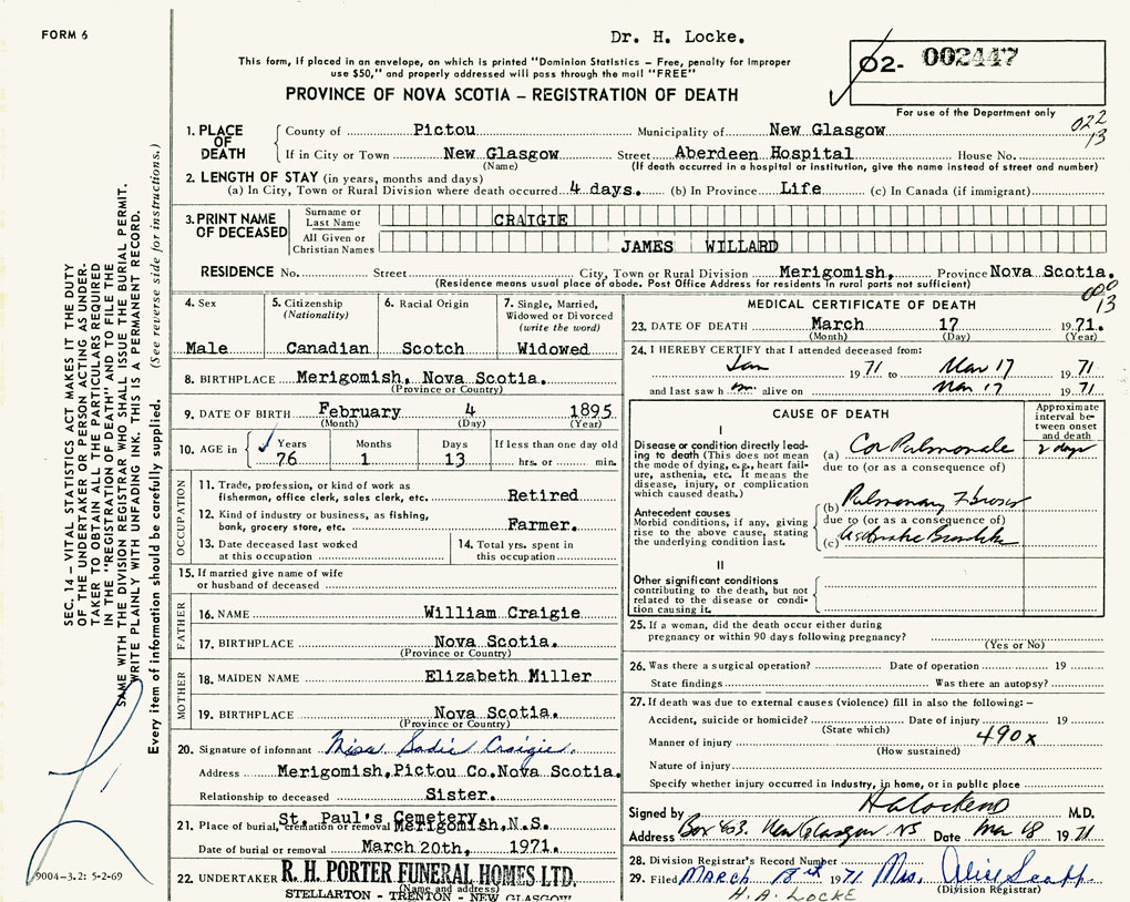 PROVINCE OF NOVA SCOTIA — REGISTRATION OF DEATH