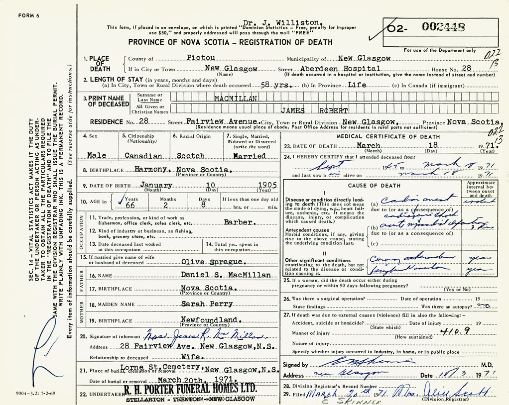 PROVINCE OF NOVA SCOTIA — REGISTRATION OF DEATH