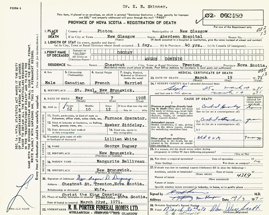 PROVINCE OF NOVA SCOTIA — REGISTRATION OF DEATH