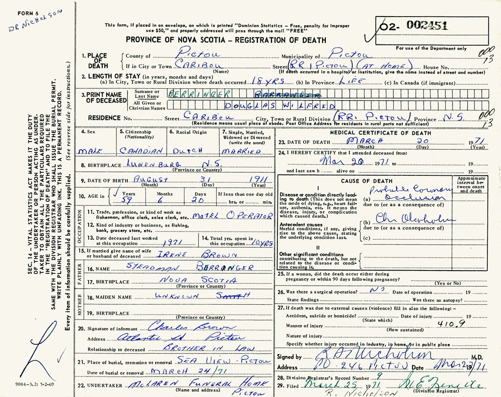 PROVINCE OF NOVA SCOTIA — REGISTRATION OF DEATH