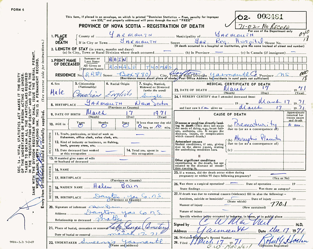 PROVINCE OF NOVA SCOTIA — REGISTRATION OF DEATH