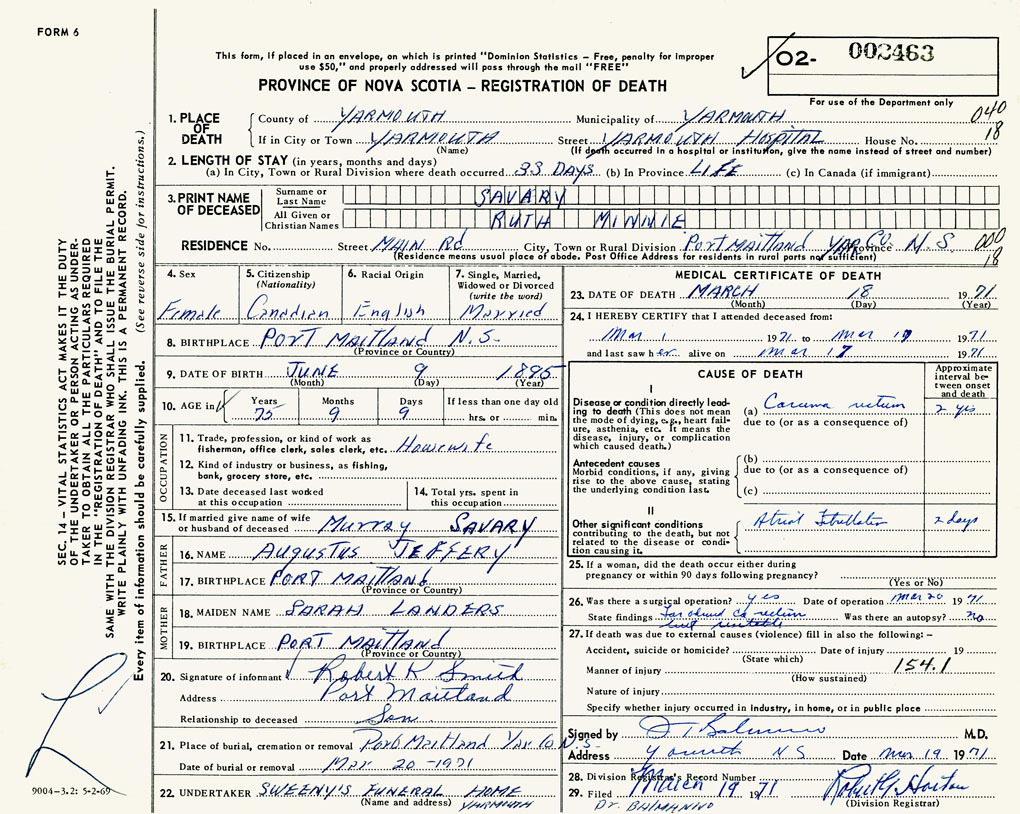 PROVINCE OF NOVA SCOTIA — REGISTRATION OF DEATH