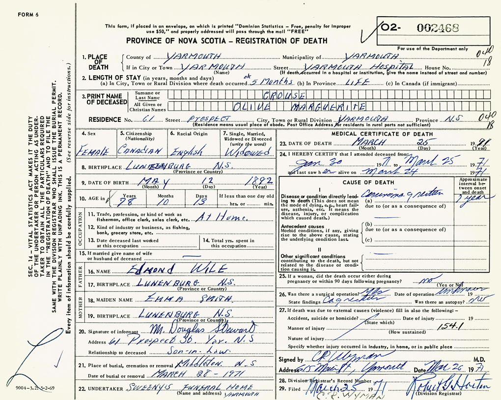 PROVINCE OF NOVA SCOTIA — REGISTRATION OF DEATH