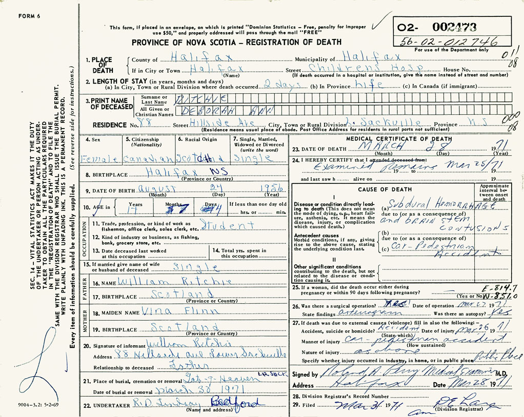 PROVINCE OF NOVA SCOTIA — REGISTRATION OF DEATH