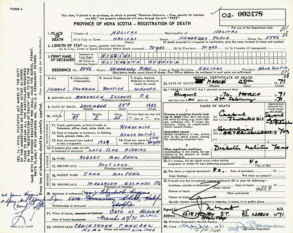 PROVINCE OF NOVA SCOTIA — REGISTRATION OF DEATH