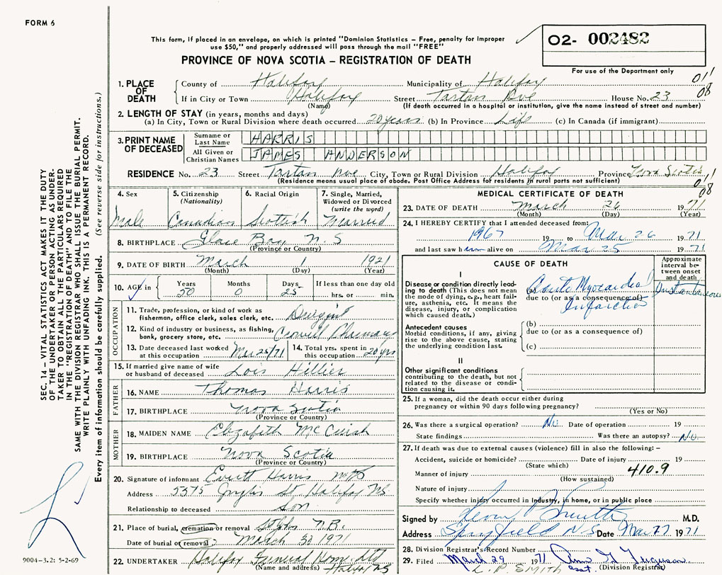 PROVINCE OF NOVA SCOTIA — REGISTRATION OF DEATH