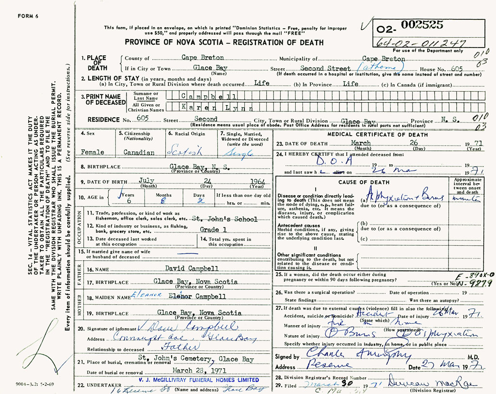 PROVINCE OF NOVA SCOTIA — REGISTRATION OF DEATH