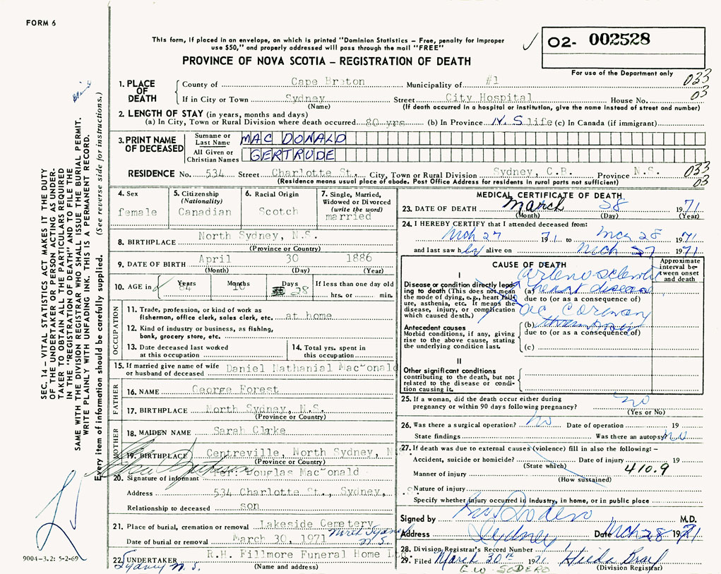 1. PLACE OF DEATH County of Cape Breton If in City or Town Sydney