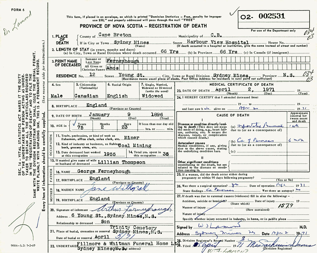1. PLACE OF DEATH County of Cape Breton If in City or Town Sydney Mines