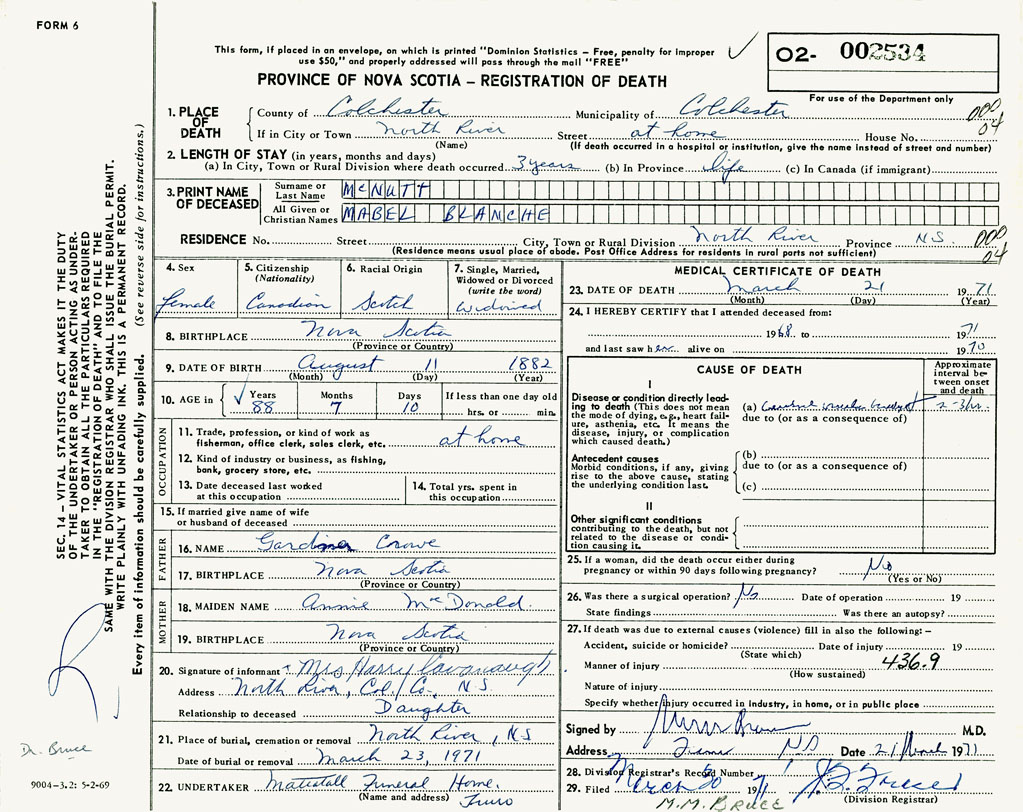 PROVINCE OF NOVA SCOTIA — REGISTRATION OF DEATH