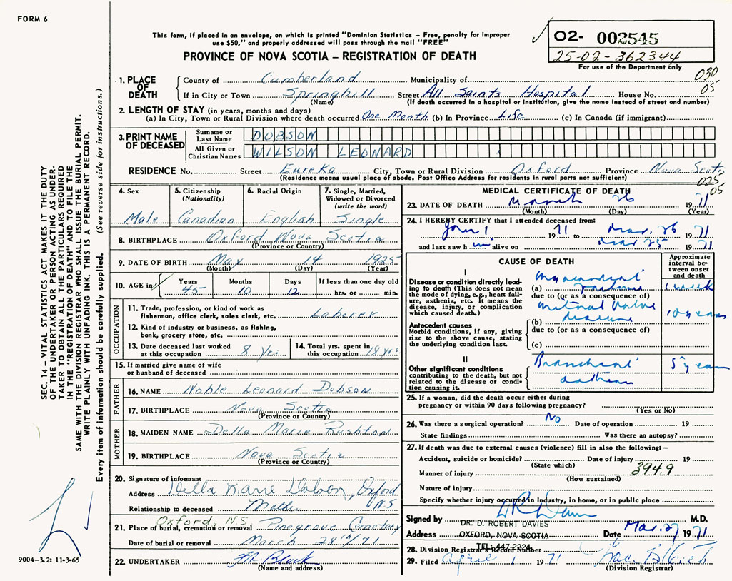 PROVINCE OF NOVA SCOTIA — REGISTRATION OF DEATH