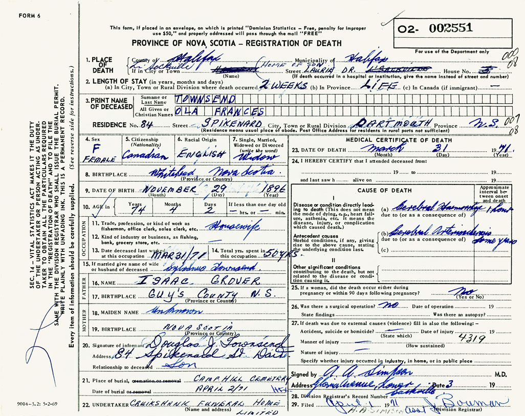 PROVINCE OF NOVA SCOTIA — REGISTRATION OF DEATH