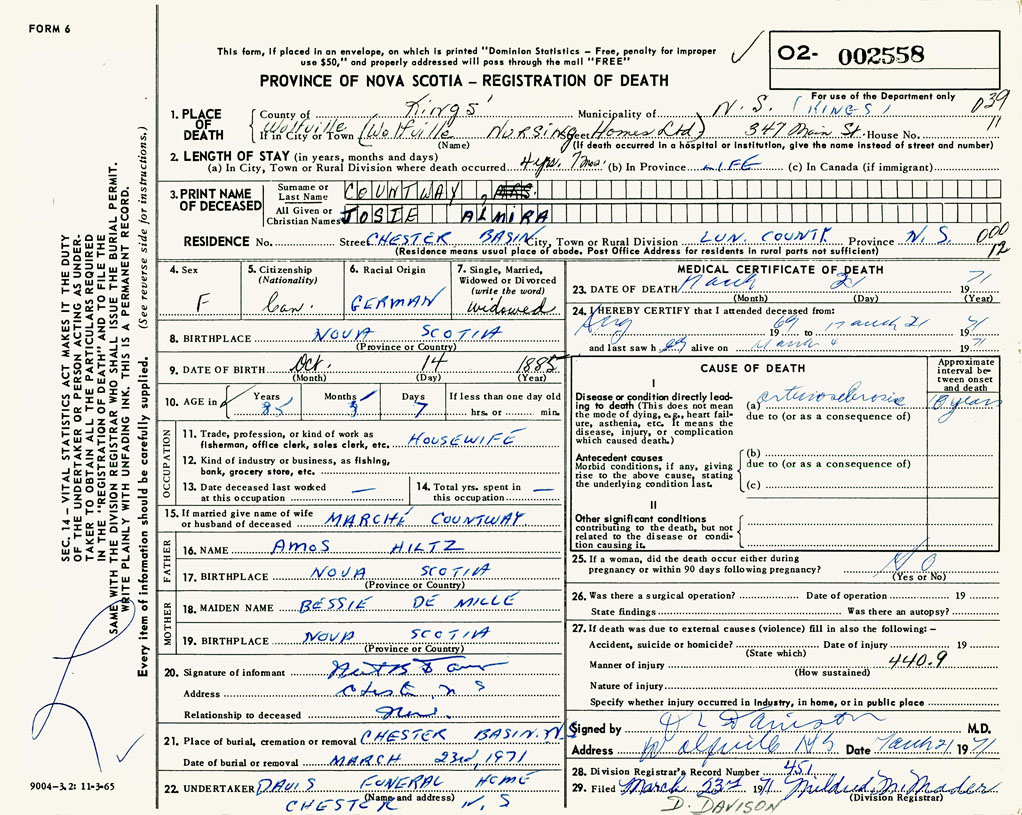 PROVINCE OF NOVA SCOTIA — REGISTRATION OF DEATH