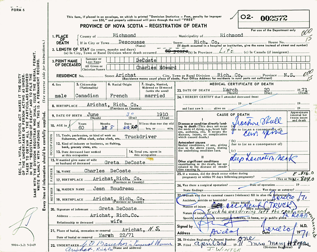 PROVINCE OF NOVA SCOTIA — REGISTRATION OF DEATH